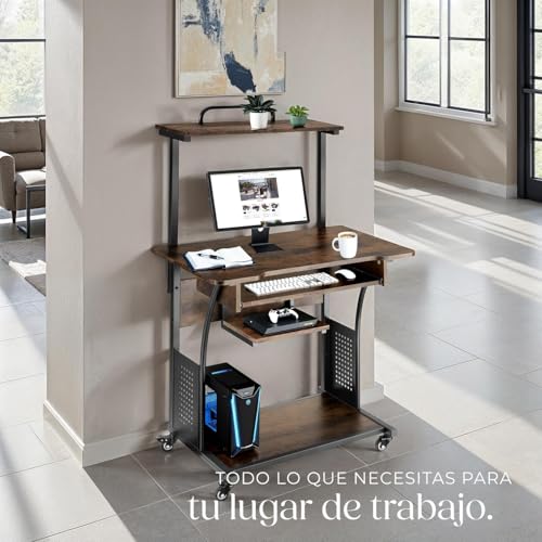 Tectake Escritorio industrial 3 estantes/ruedas 80x65,5x130,5 cm madera oscura