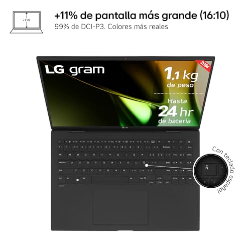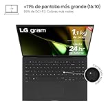 LG gram 16ZD90S-G.AX75B - Portátil Ultraligero de 40.6 cm (16") 2560x1600, Panel IPS Antirreflejo, Intel Core Ultra 7, 16 GB RAM, 512GB SSD, 1199 g, Batería 24 Horas, FreeOS, Negro Obsidiana