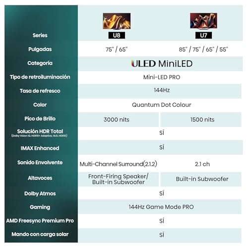 TV Mini LED 75 - Hisense 75U8NQ, UHD 4K, LED, Smart TV, 144Hz, Hi-View, IA, Imax, Dolby VIsion&Atmos,; Negro