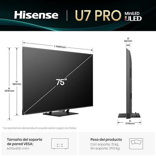 TV Mini LED 75 - Hisense 75U7Q PRO, UHD 4K, 165 Hz, Sonido 2.1.2, Quantum Dot, Sensor de Luz IA, Negro