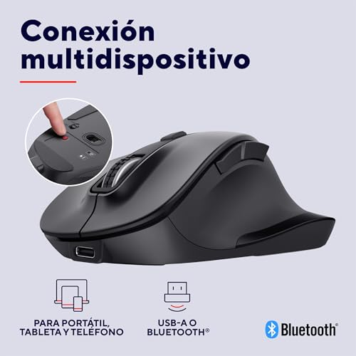 Trust Fyda Ratón Inalámbrico Recargable Bluetooth + 2.4GHz, Reposapulgar Ergonómico, 50% Plástico Reciclado, 800-2400 dpi, Mouse Multidispositivo PC Ordenador Portátil iOS Android Mac