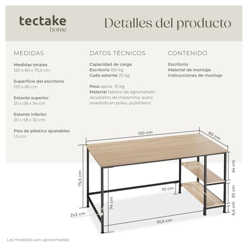 Tectake Escritorio estilo industrial 2 estantes 120x60x75,5 cm madera clara